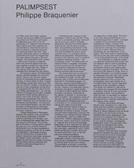 Palimpsest explores the makeup of the conceptual and physical landscape of Western cultural knowledge and heritage: how does contemporaneity assert itself from the penumbra of history? The primary task of the book is not so much to explain the past as it is to consider historical development and its visual expressions. Using photography and text as its means of investigation, the publication emerges from the intersections of science and culture, natural and man-made, analogue and digital, visible and hidden. On its pages, history and the present converge through these seeming polarities and propose a persuasive argument to refigure temporality. Palimpsest is an ongoing project that began in 2012 and like any 'living' archive, it keeps growing constantly. Approaching the book as a work-in-progress, Braquenier debunks the publication, and the idea of history itself, as something imprisoned in the past, as inactive and immobile. The work illustrates how material history is constantly being altered and added on. It questions the methods mankind uses to preserve historical records - and knowledge overall.